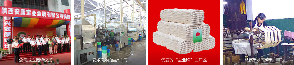 陜西安康寶業(yè)絲綢有限公司始建于1958年。是由原安康市國有企業(yè)改制而成的中型民營企業(yè)。公司地處秦嶺南部,氣候濕潤,風(fēng)景宜人,有得天獨(dú)厚的自然條件非常適宜于種桑養(yǎng)蠶,是全國重要的優(yōu)質(zhì)蠶桑生產(chǎn)基地之一。 公司技術(shù)力量雄厚,裝備精良,擁有較先進(jìn)的自動(dòng)繅絲機(jī)6000緒/15組,年產(chǎn)桑蠶白廠絲600噸。